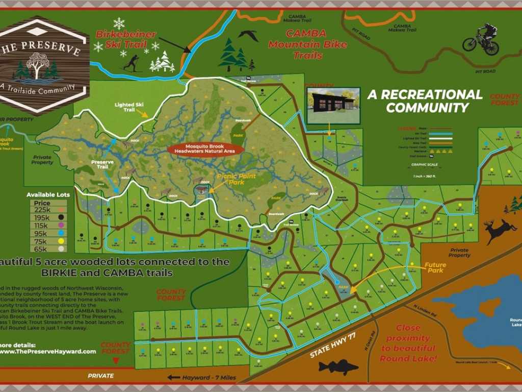 Brand new mono pitch cabin to be built in The Preserve summer of 2025. Lot 45 has a nice bench building site looking south over a scenic wetland. Lot 45 borders 100’s of acres of Sawyer County Forest on the north side, and has ski/hike/bike trail access to The Birkie and CAMBA trails, via our private trail system. This site is heavily wooded, and has a gradual driveway grade sloping down from the road access on the north to the build site on the south. The view of the wetland will be bracketed by several large pine trees. One couple bought the two lots on the east side of this (43 and 44) and plan to build one home, so this lot will have one neighbor with 5 acres on the west side and one neighbor with 10 acres on the east side, so it will be very private. The wetland rarely holds standing water, but it is a spongy peat bottom that you can walk on, with tamarack trees and tons of wildlife.