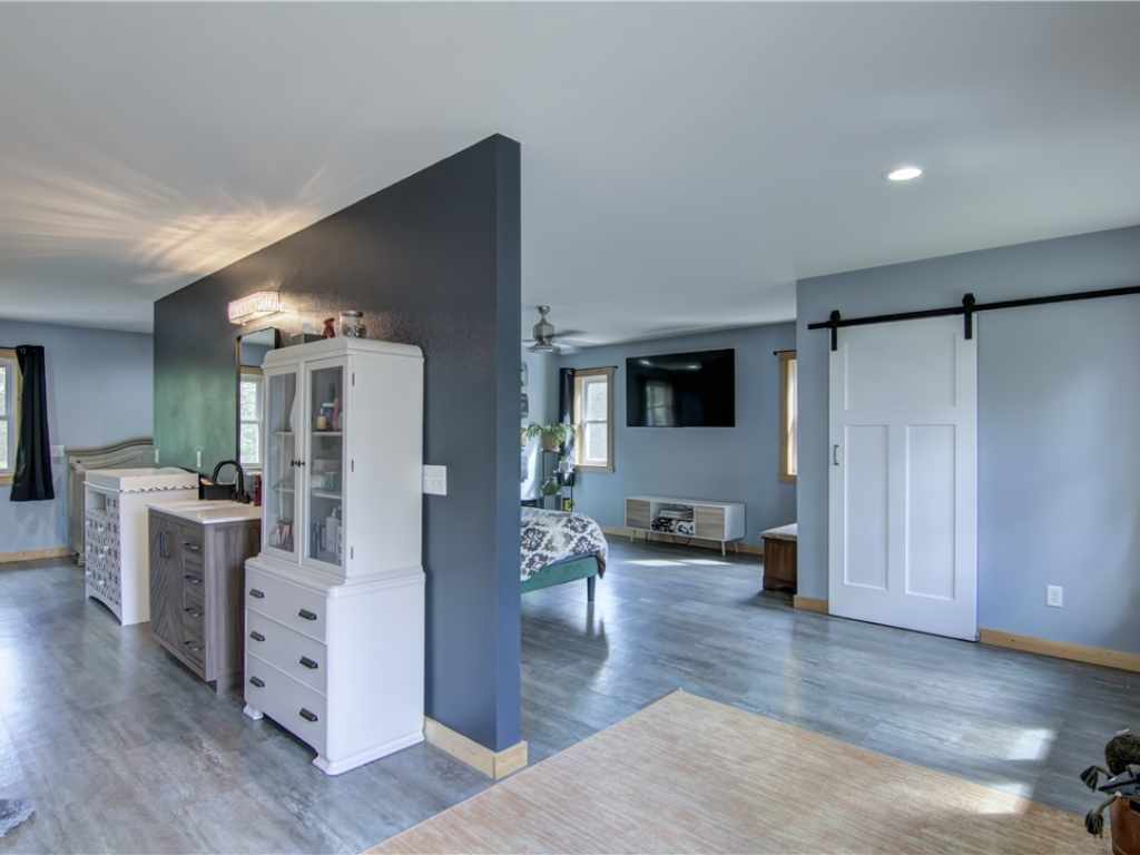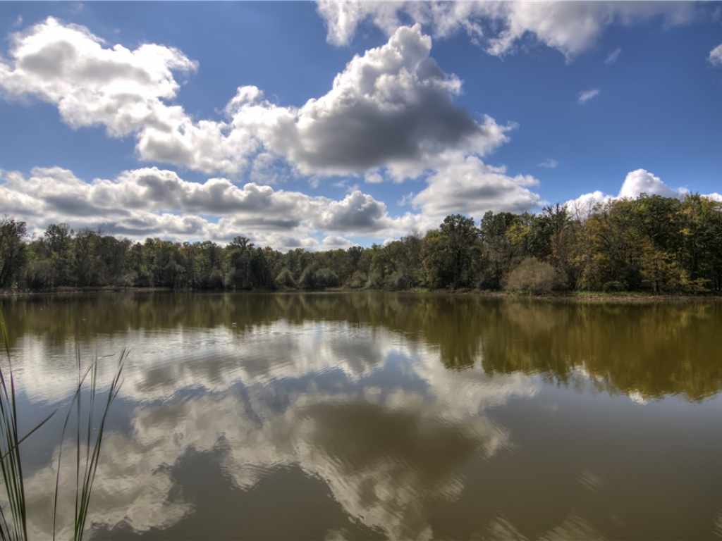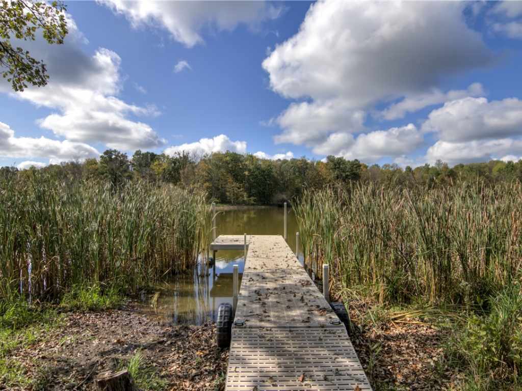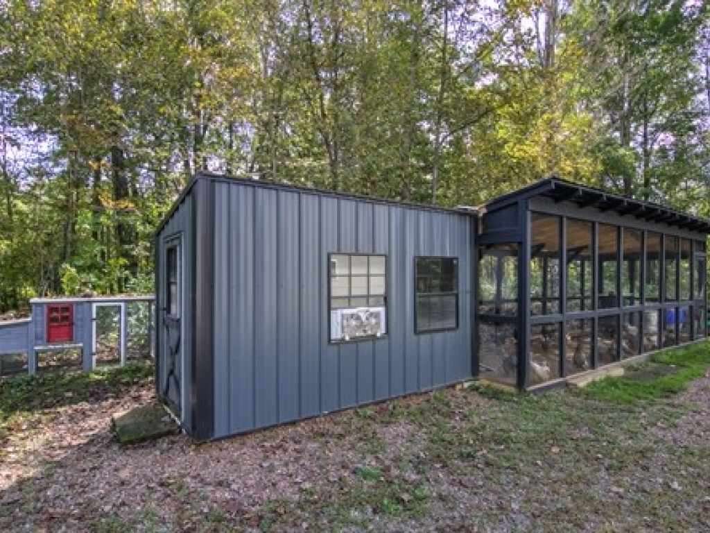 Many quality items are included with the sale, such as two wall-mounted smart TVs (55" and 65"), a new dock on the private 7-acre lake, an invisible pet fence system, a security camera system, raised garden bed, and a deluxe chicken coop with attached run.