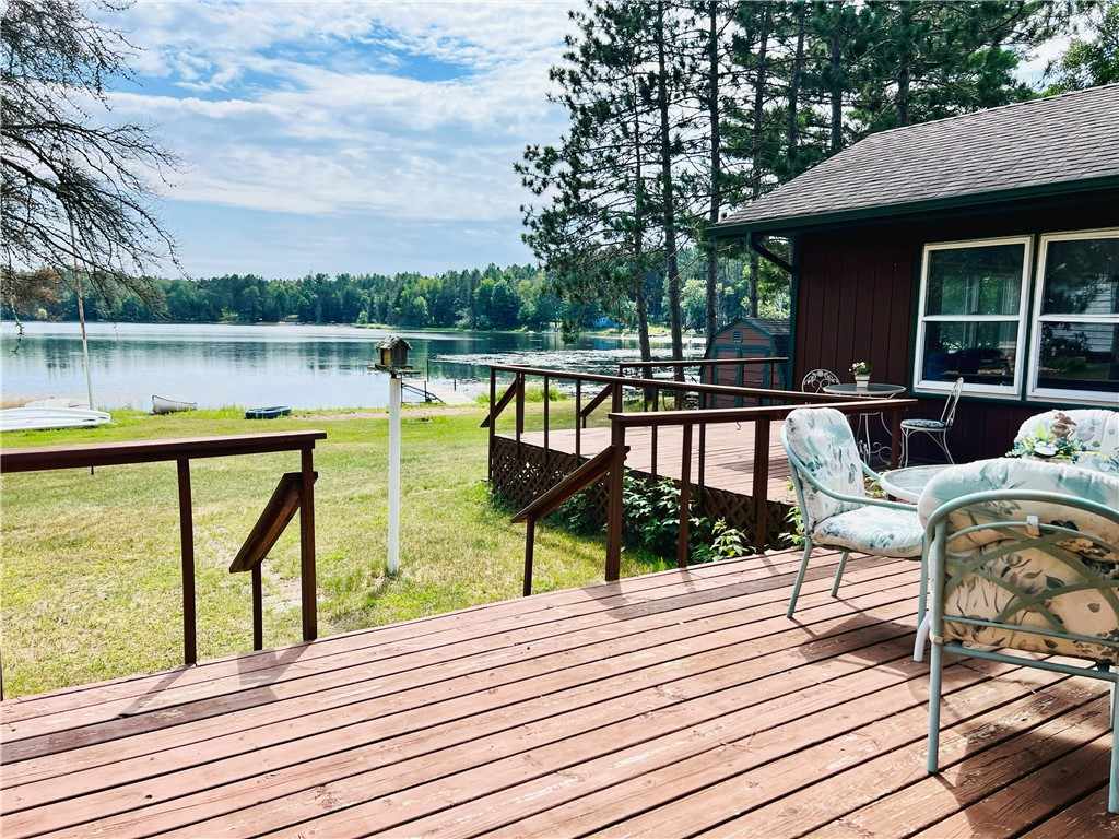 This beautiful 3 bedroom, 1.5 bath lake home, with its open concept design, is situated on a lovely spring-fed, crystal clear lake water with level access to the sandy shoreline. The single-family ranch home sits back far enough from the lake for possible expansion and has four entrances: side, back, and two sets of front patio doors leading to the open wrap-around deck which is perfect for entertaining or enjoying a quiet morning coffee with a view of the lake. The home is suitable for all four seasons, allowing for year-round enjoyment. The half bath also serves as a large laundry room with a utility sink. The property offers ample space for additional family, friends and off-street parking. It has been landscaped with flower gardens. Trees and stumps have been removed to give you a gorgeous view of the lake. Also included a rollaway dock, boat, and canoe.