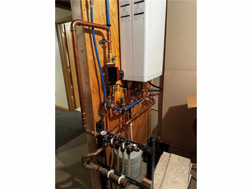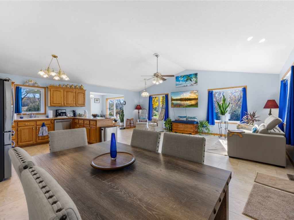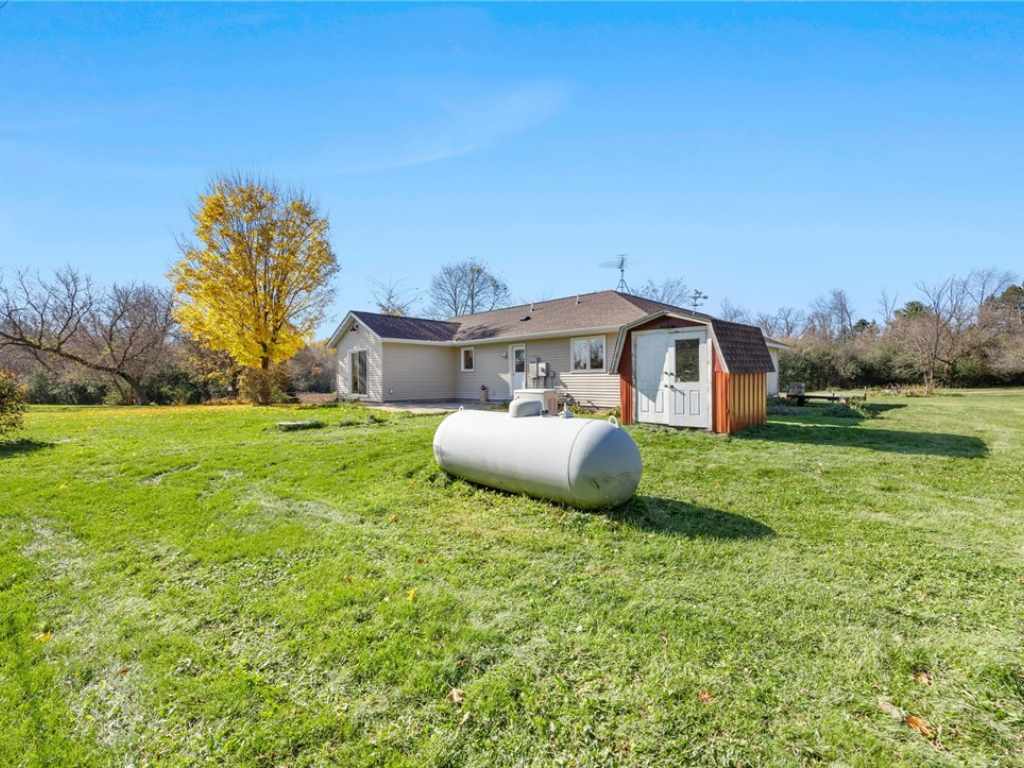 Beautifully maintained custom-built home with an open floor plan and thoughtful updates throughout, located on 5 acres! The vaulted kitchen and dining area flow into a bright south-facing sunroom, perfect for enjoying natural light. Relax on the front porch or back patio while taking in the peaceful, landscaped yard with country views and visiting wildlife. The main level features a private owner’s suite with a walk-in closet and new carpet, main floor laundry, and an insulated, heated garage. The lower level offers in-floor heat, a spacious family room, a second bedroom, a full bath, and a bonus room ideal for office or guest space. There’s also potential to add a walk-out patio, with some excavation already started. MANY NEW UPDATES include stainless steel kitchen appliances, luxury vinyl tile flooring in the kitchen, dining & sunroom, washer and dryer, tankless water heater, water softener, forced air furnace, heat pump, roof shingles, a 22,000-Watt whole house generator, garage furnace, and MORE! Heat pump provides heat to 25 degrees and air conditioning, a huge savings on propane gas and electricity. Move-in ready and set in a private, country setting, this home truly has so much to offer!