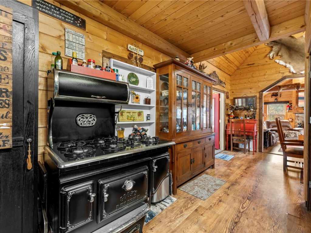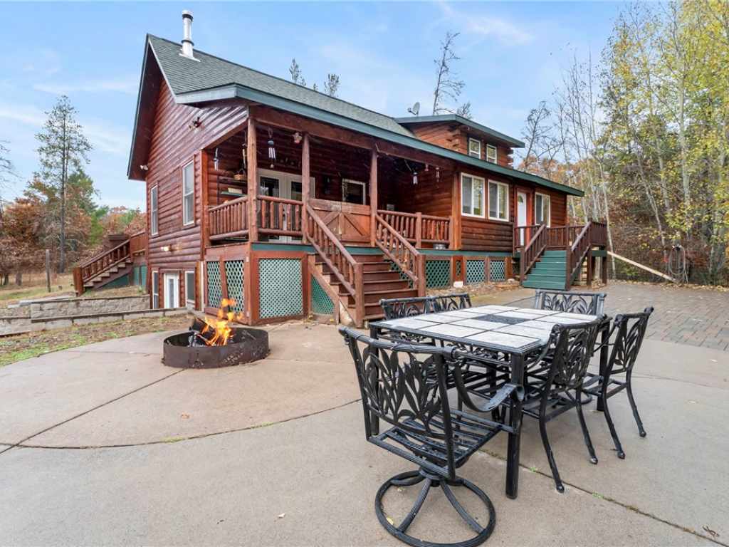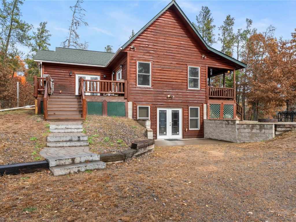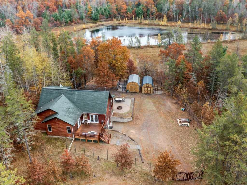 Custom-built private retreat 3BR/3BA home on 8.21 wooded acres, offered for the first time! Surrounded by over 100 acres of conservancy land open to public hunting and hiking. The main level features an open layout with vaulted wood ceilings, custom cabinetry, a clawfoot tub, and a beautiful stone wood-burning fireplace. Spacious primary suite with private bath and deck access. LL walkout includes a rec room with bar area—perfect for guests or entertaining. Enjoy peaceful views from the covered porch overlooking the spring-fed pond and watch deer cross your driveway. Addl highlights: 20x40 pole building, 2 sheds (both w/power, one w/water), and ATV/snowmobile trail access within 1 mile. In-town amenities include Parduns Canoe Rental and side-by-side rentals for exploring the scenic St. Croix River. Minutes from area lakes, dining, and recreation—an ideal year-round home or weekend getaway offering unmatched privacy, comfort & Northwoods charm!