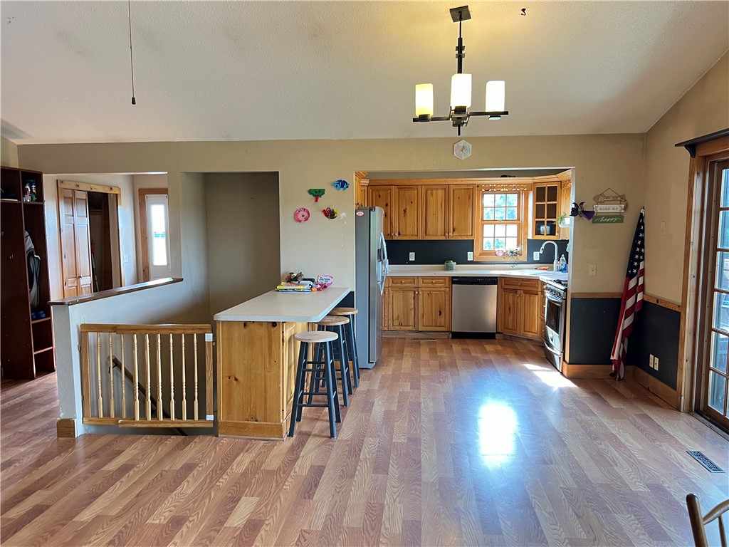 Check out this stunning remodeled 5 bed / 2 bath home that offers ample space for the entire family. Featuring a spacious vaulted, open-concept living area and an easy flow updated kitchen, this home boasts large bedrooms and bathrooms on both levels. The lower-level family room is complete with a walkout to the patio, above is a wraparound deck overlooking the private backyard with amazing wooded country views with abundant wildlife. Situated on nearly half an acre, the property includes a 2-car garage and a garden shed for all your storage needs. Conveniently located just down the road from Shell Lake Schools, this home provides easy access to numerous amenities, including the highly popular Shell Lake beach just a few blocks away. Enjoy nearby ATV and snowmobile trails, as well as access to several pristine fishing lakes in the Shell Lake area. New roof and some siding. New roof 2025 and new flooring coming to lower level.
