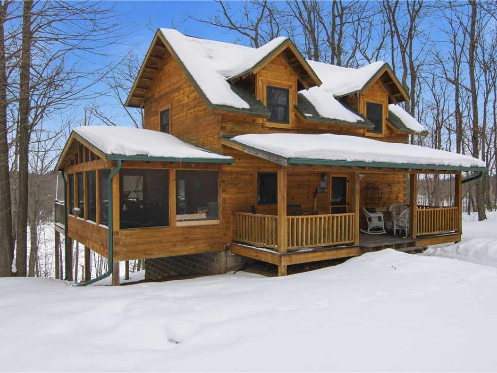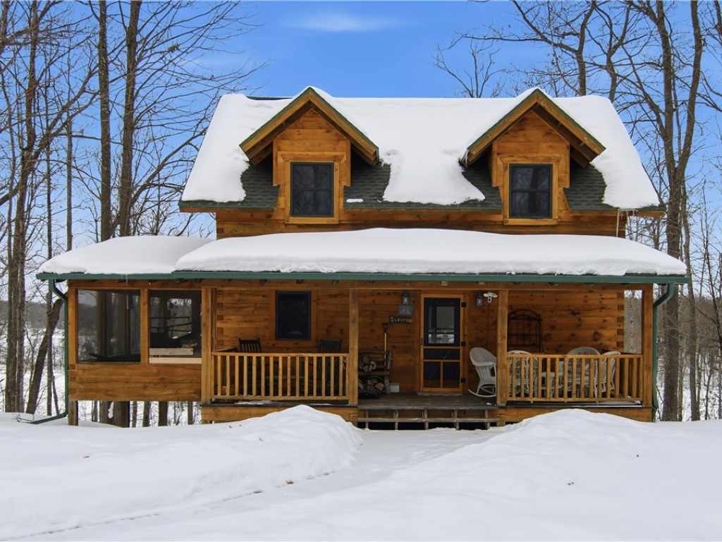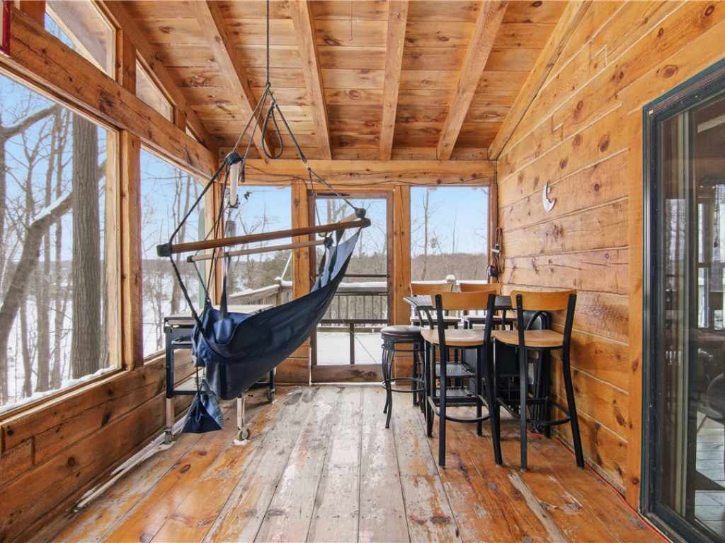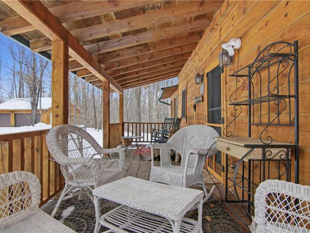 Beautiful timber-framed Adirondack-style home with creek frontage located between Round Lake and Lovejoy Lake. This well-maintained property offers three bedrooms and two full baths, featuring warm wood finishes and classic cabin character throughout. The main level includes an inviting living area with a wood stove, an open layout, and access to a large screened porch, covered porch, and expansive deck with scenic views. The full walkout lower level provides additional living space and storage options. Exterior amenities include a three-car detached garage, a well-built wood shed, and generous outdoor areas for recreation and relaxation. The property is within walking distance of Lakeview Golf Course and only minutes from Round Lake, offering convenient access to local amenities and outdoor activities. A rare opportunity to own a quality timber-frame home in a desirable Northwoods setting.