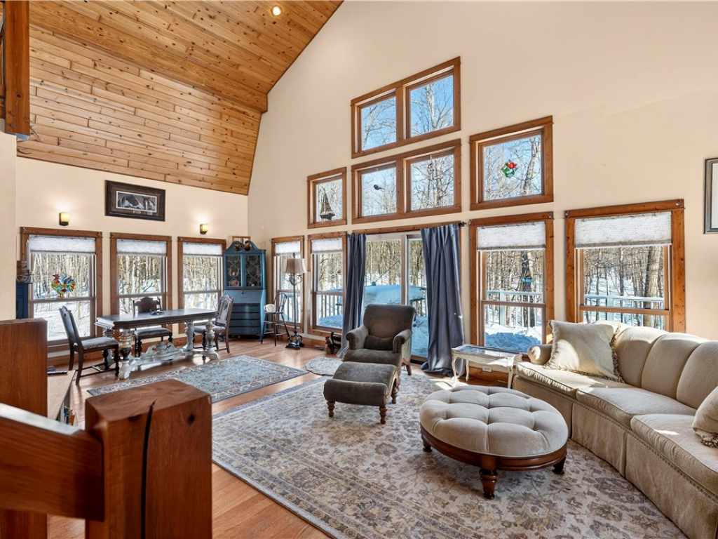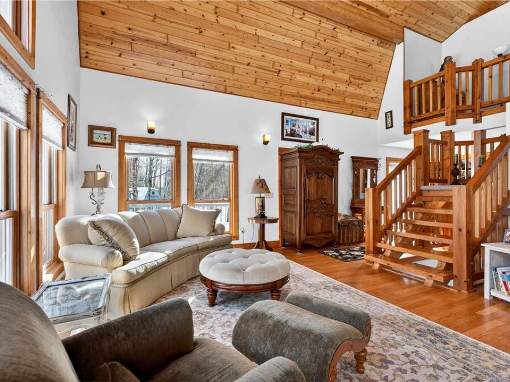Nestled on two private wooded lots, this custom-built rustic retreat blends natural beauty with exceptional craftsmanship. From the moment you step inside, you’re greeted by a stunning pine vaulted ceiling and an abundance of natural light. A handcrafted timber-frame staircase & railing (custom designed & built by Dobiehill Timberworks exclusively for this home) serve as a striking architectural centerpiece. The upper-level loft overlooks the main living area, creating an open, airy feel while maintaining cozy charm. The lower level walk-out opens directly to the backyard & features a family room & space for a third bedroom. Generously sized bedrooms offer comfort & versatility, making this property ideal as a full-time residence or a peaceful getaway. Loft can also be a 3rd or 4th bedroom. Part of the Loch Lomond Beach Club, which provides numerous additional perks. Membership gives you access to outdoor pool, tennis courts, pickleball courts, bar area, deck, children's playground, and best of all, lake access and an opportunity to have your own boat slip on Red Cedar Lake without having to pay lakefront taxes. New furnace 2024 & new appliances. Beautiful rose stone driveway.