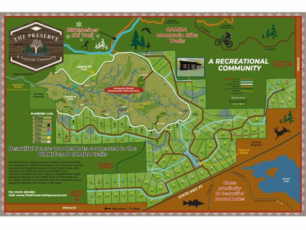 Brand new cabin TO BE BUILT on Lot 5 in The Preserve in 2026. THE PRESERVE is a new outdoor recreation & trail side community, just 7 miles from Hayward, offering 5+ acre wooded lots. Each lot offers access to a ski/bike trail system that joins the Birkie & CAMBA trails. The Preserve trail system boasts an incredible flat ski/hike/bike trail around most of the old Mosquito Brook Flowage. Tucked in a large tract of Sawyer County Forest with Forestry Zoning, across from Round Lake, and 10KM of groomed trails (some lighted trails), you will find peace in this sanctuary of rolling hills and pristine forest. Mosquito Brook is a class 1 brook trout stream, the brook along with parts of the Flowage lakebed offers great wildlife viewing opportunities. Buyer may have the ability to make color & material choices for some aspects of the cabin. Photos may show some "upgraded items" that may not be included in listing price, see attached brochure (ask agent) for included materials and upgrade options. See https://The Preserve Hayward.com/ for further information and details about The Preserve. CABIN HAS NOT BEEN BUILT YET, PHOTOS ARE COMPUTER GENERATED.