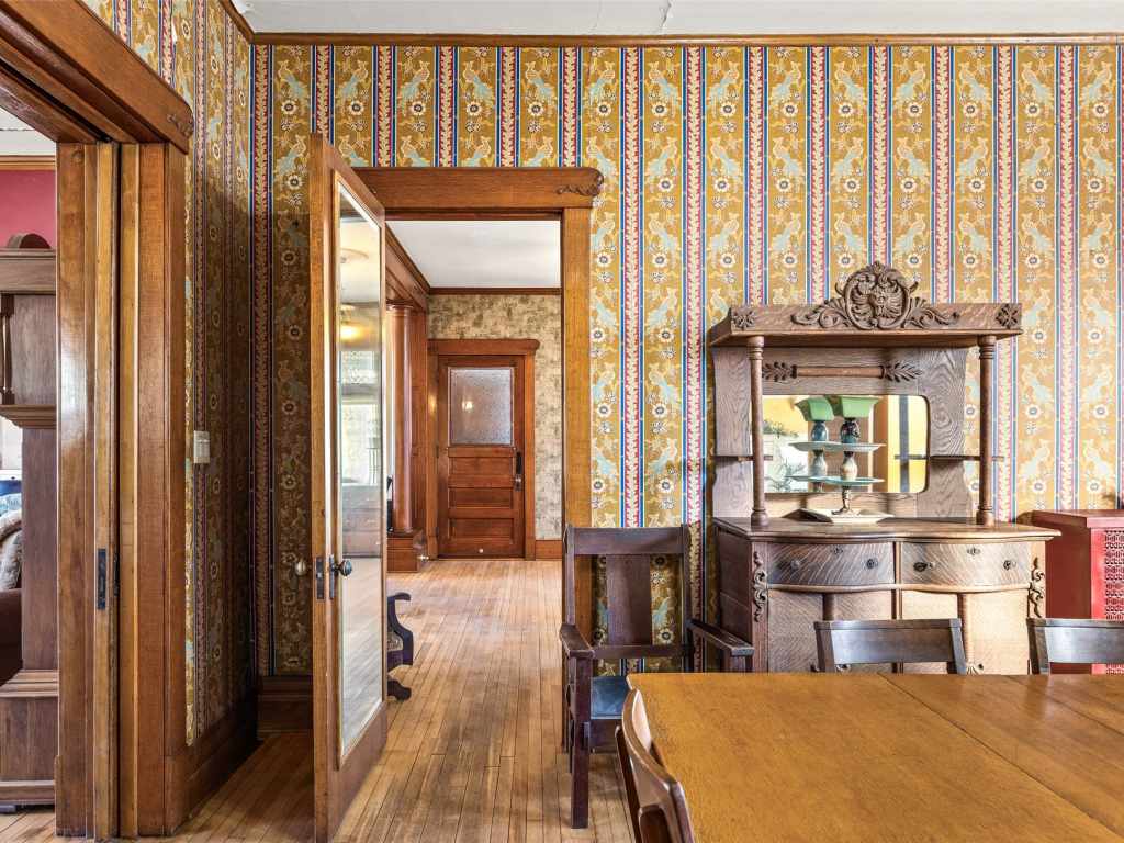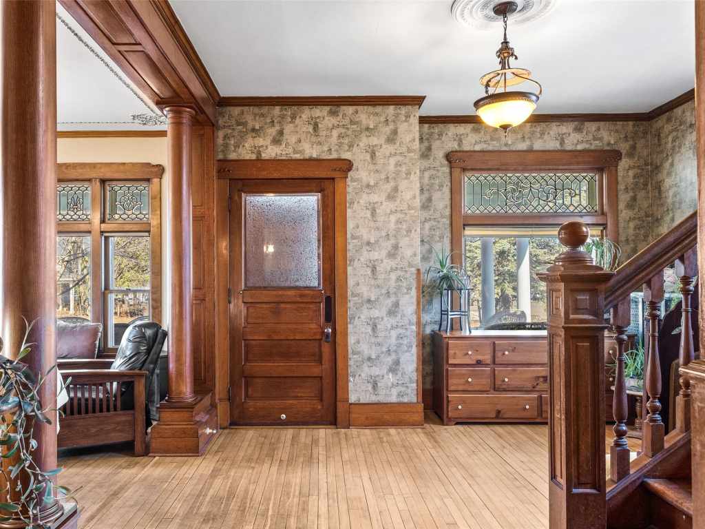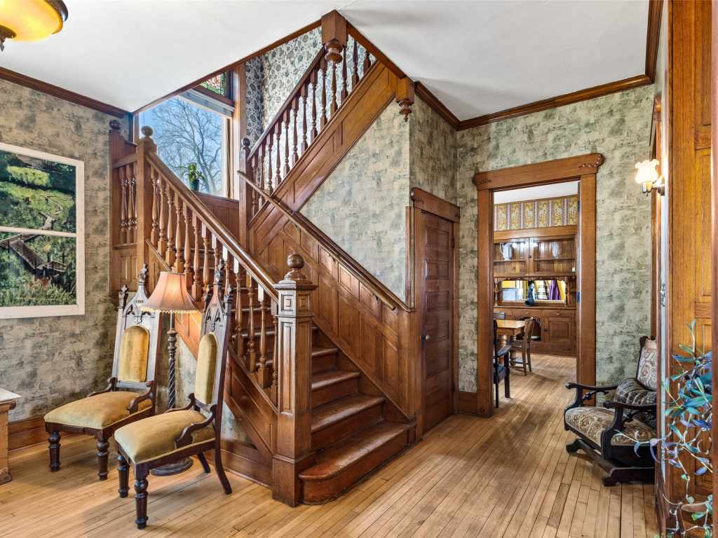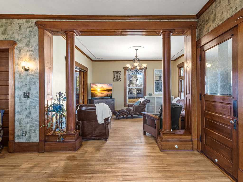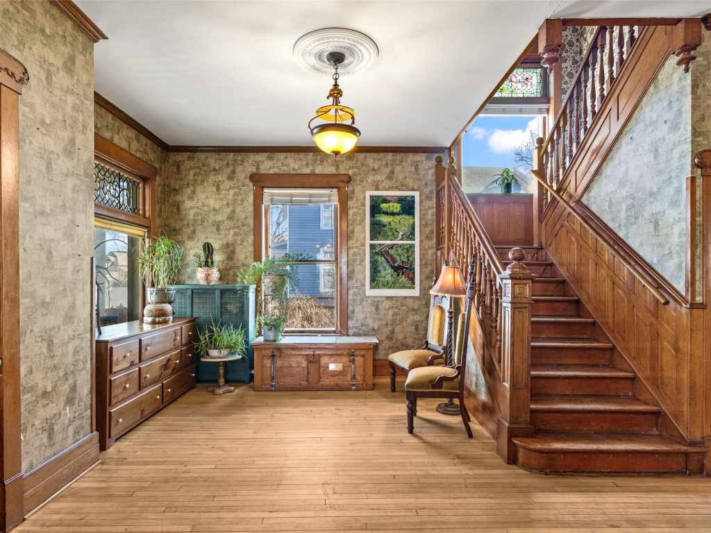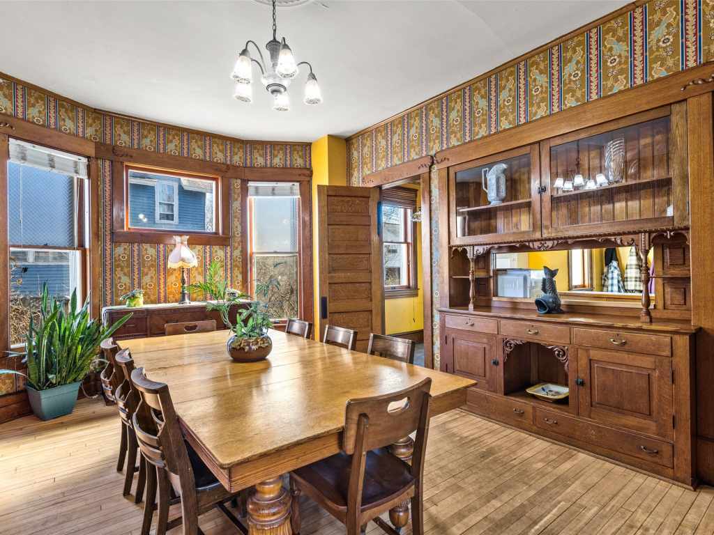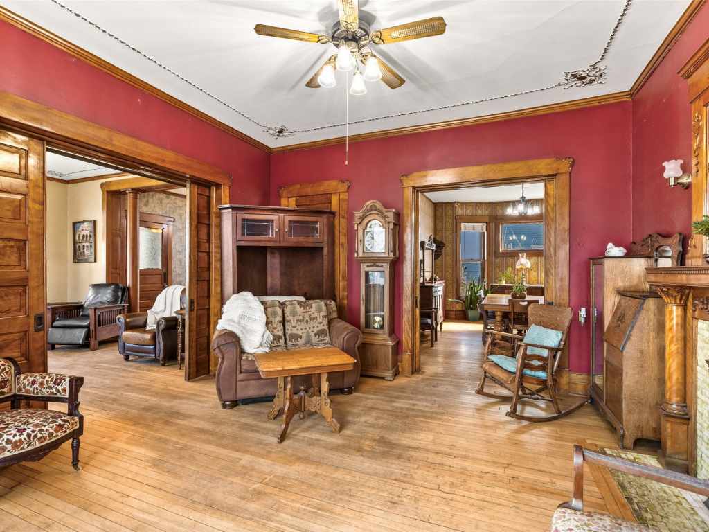 Recognized by the Wisconsin Historical Society, the Herman T. Lange Residence is a classic 1901 Queen Anne home with Colonial Revival influence located near downtown Eau Claire. This 5-bedroom, 4-bath home offers three finished levels above ground plus a full basement, combining historic character with functional living space. The home showcases many original architectural details including beautiful woodwork, pocket doors, stained and leaded glass windows, transom windows, and tall ceilings that reflect the craftsmanship of the early 1900s. Some of the woodwork has been carefully refurbished with the intention of maintaining the home’s historic character while allowing for everyday living. The third level has recently been finished into a spacious primary suite with an ensuite bathroom, adding additional living space while preserving the home’s historic feel. The home also offers abundant storage throughout and a full basement with taller ceilings that provides excellent space for a workshop, hobby area, or additional storage. Over time, updates have been made to electrical, water lines, windows, and mechanical systems. The home is served by a boiler heating system, and all exterior porches were rebuilt approximately three years ago. Situated on a generous lot with a fenced backyard and established front flowerbeds, the property offers space and charm in one of Eau Claire’s historic residential areas. Conveniently located near Mayo Clinic Health System, downtown Eau Claire, and the Chippewa River corridor with scenic walking trails, this home presents a rare opportunity to own a distinctive piece of Eau Claire’s architectural history.