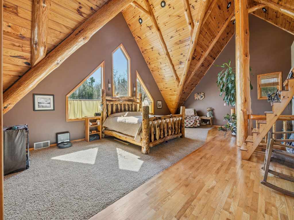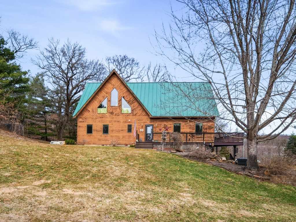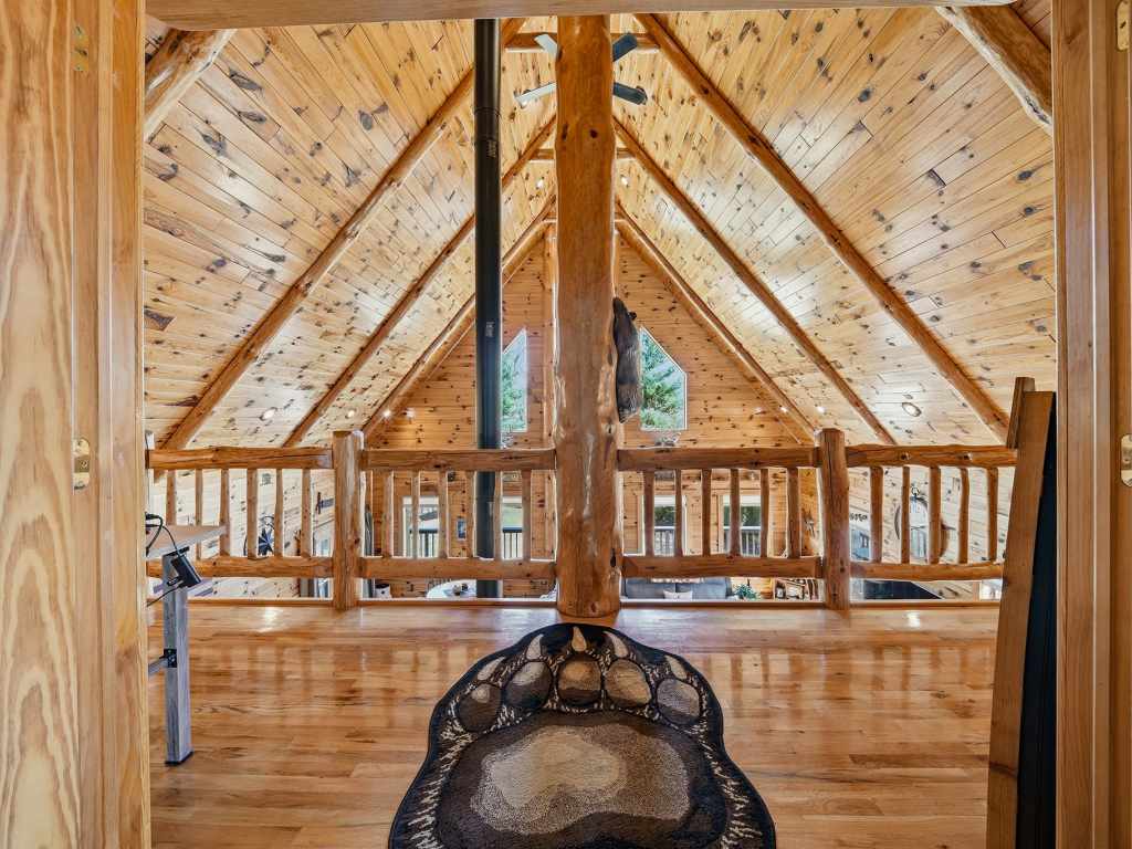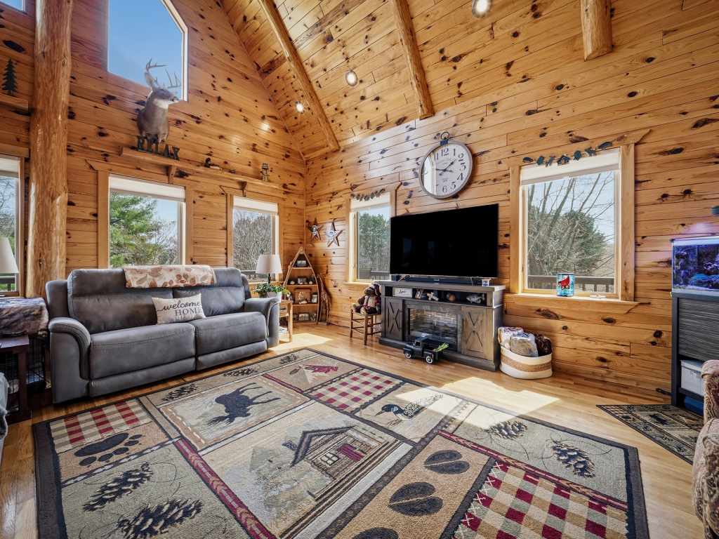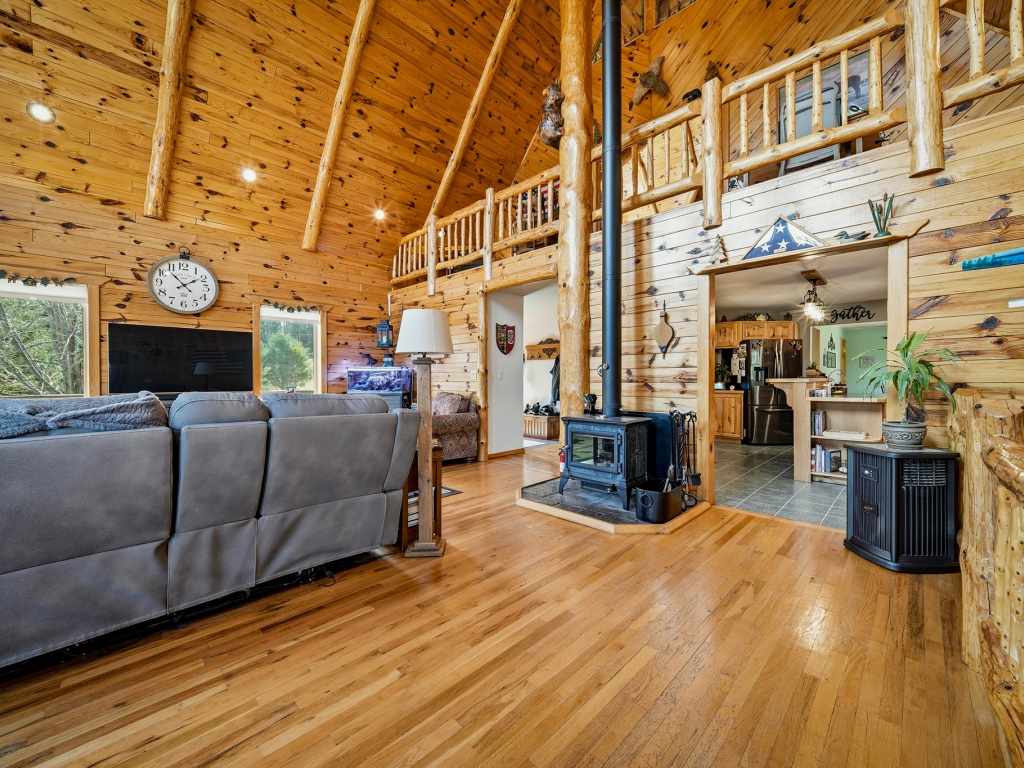 Beautiful Lodge-Style Retreat! Experience the perfect blend of rustic charm and modern comfort in this one-of-a-kind home set on over an acre of rolling countryside. Surrounded by peaceful nature and abundant wildlife, this property offers beautiful views and a truly serene setting. Step inside to a warm, inviting interior featuring pine tongue-and-groove finishes, hand-hewn log accents crafted from trees right off the property, and a dramatic Great Room filled with grand windows that capture the beauty of the outdoors. A cozy wood stove enhances the lodge-like feel, creating the perfect space to relax and unwind.